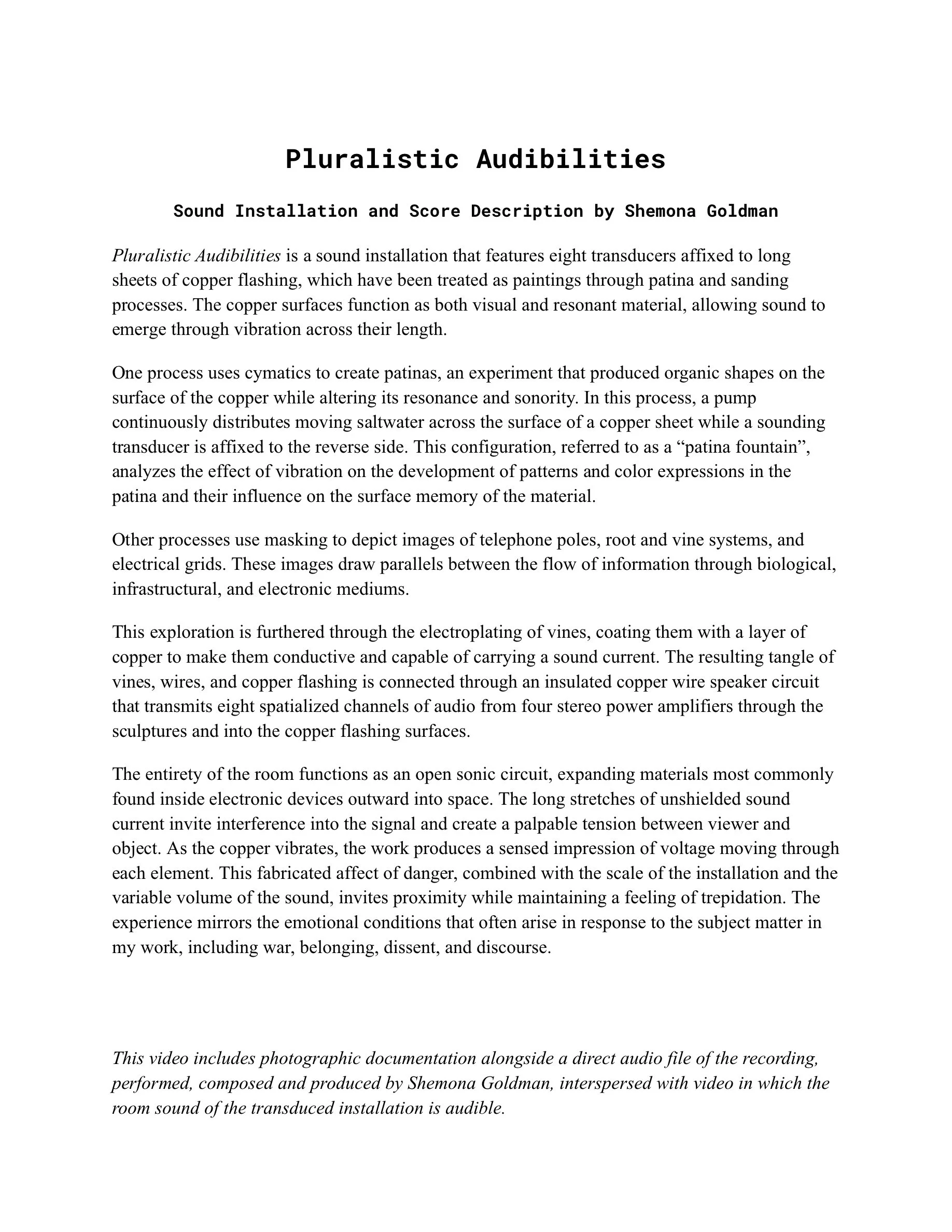 Pluralistic Audibilities Spatialized sound sculptural work. See below for video documentation, description and score.